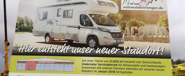 Das Fundament ist gegossen – Gerüst und Bautafel stehen: Schon bis Januar 2018 soll unser neuer Standort in Höchstadt an der Aisch fertig gestellt werden. Auf einer Fläche von etwa 21.000 Quadratmetern entsteht Deutschlands modernster Servicebetrieb für Reisemobile und Kastenwagen. Wir hoffen auf weiterhin gute Zusammenarbeit mit unseren Partnern.