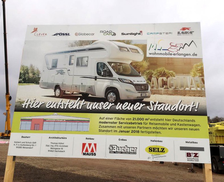 Das Fundament ist gegossen – Gerüst und Bautafel stehen: Schon bis Januar 2018 soll unser neuer Standort in Höchstadt an der Aisch fertig gestellt werden. Auf einer Fläche von etwa 21.000 Quadratmetern entsteht Deutschlands modernster Servicebetrieb für Reisemobile und Kastenwagen. Wir hoffen auf weiterhin gute Zusammenarbeit mit unseren Partnern.