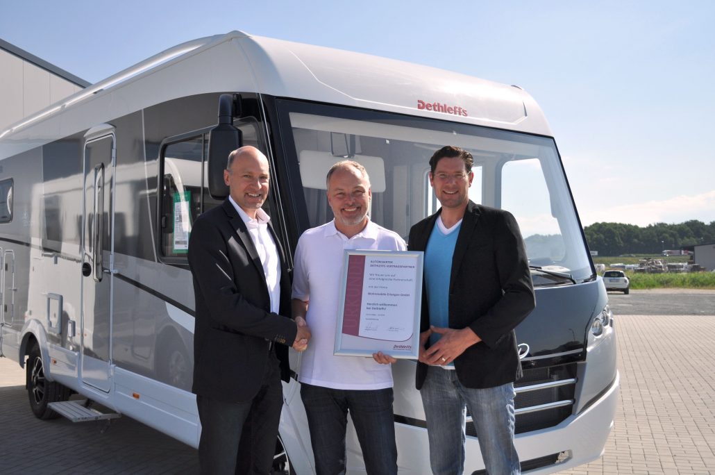 Bei ihrem heutigen Besuch besiegelten Dethleffs-Geschäftsführer Alexander Leopold (links) und Andreas Kohlert von Wohnmobile Erlangen die künftige Zusammenarbeit. Ab sofort bietet Wohnmobile Erlangen die Reisemobile und Wohnwagen des Herstellers an. „Mit den Modellen aus dem Haus Dethleffs bieten wir unseren Kunden eine breite Palette an Campingfahrzeugen. Neben preiswerten Einsteigermodellen und einer grundsoliden Mittelklasse mit erstklassiger Verarbeitung reicht das Dethleffs-Sortiment bis hin zu top-ausgestatteten Vollintegrierten und luxuriösen Alkovenmodellen – für allein reisende Paare ebenso wie für die Großfamilie mit vier Kindern und Hund“, freut sich Andreas Kohlert.